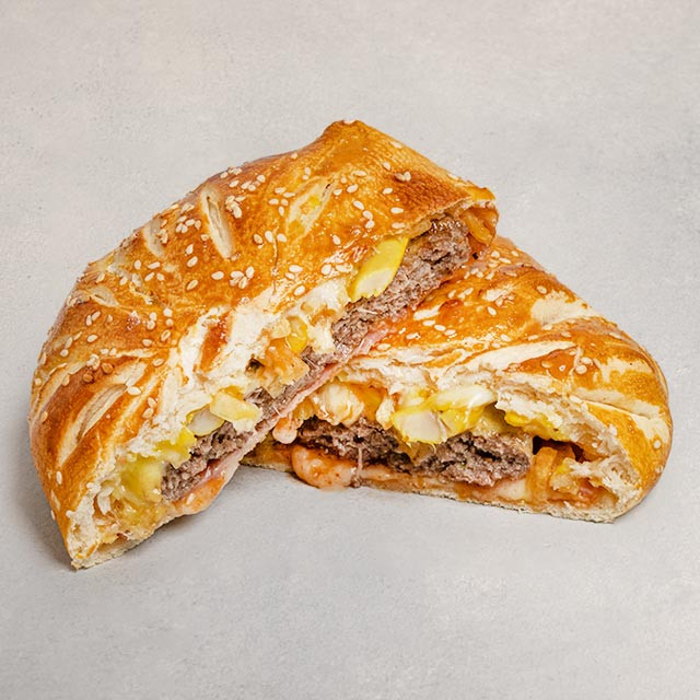 نان مخصوص ، ژامبون ۹۰ درصد ، برگر ۱۵۰ گرمی ، قارچ ، پنیر پیتزا ، چیپس خلال