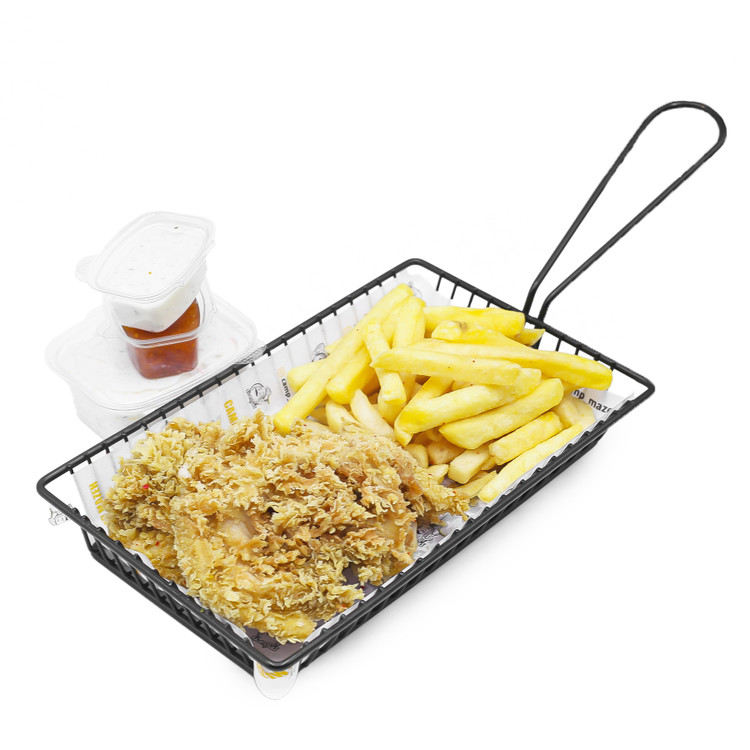 ۳ عدد فیله سوخاری ، ۲۰۰ گرم سیب زمینی ، سالاد کلم ، سس سیر